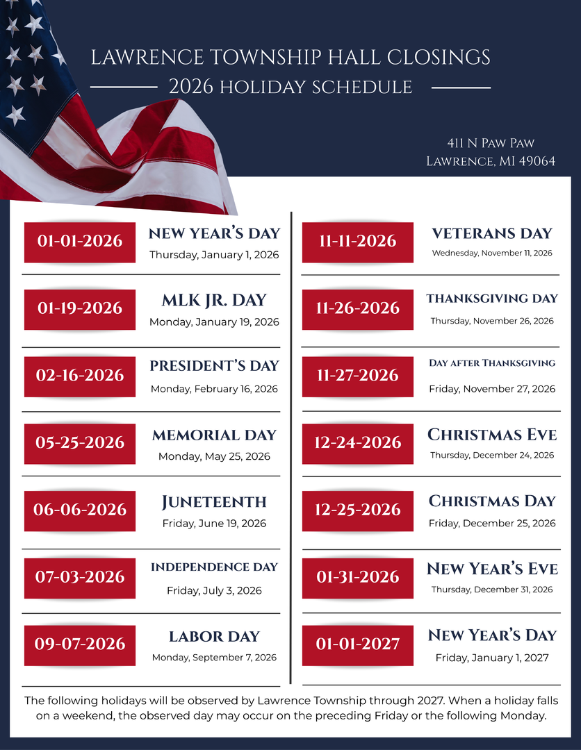 We are delighted to have you visit our online home. Situated in the heart of Van Buren County, the Township of Lawrence combines rich history, natural beauty, and a close-knit community spirit.