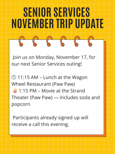 Our Seniors (60+) in the Village and Township of Lawrence or own property in Lawrence are serviced with many free activities during each year. Our citizens have elected to receive 0.50Mil in tax revenues so they can receive these services completely free.