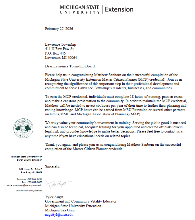 Lawrence Township would like to congratulate Matthew Sanborn on successfully earning the Master Citizen Planner (MCP) credential through Michigan State University Extension.